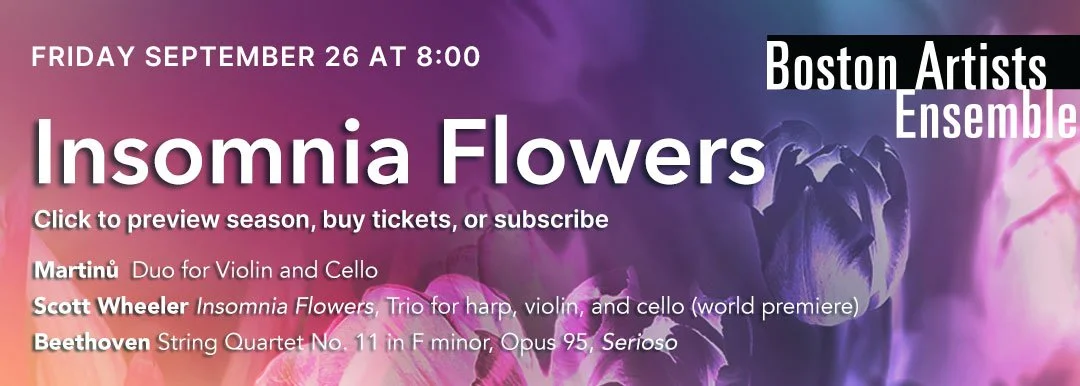Another season of five performances by the Boston Artist Ensemble begins soon! BAE's first concert of the season at Hamilton Hall is Friday, September 26 at 8pm. The concert will include Martinu's duo for violin and cello, Scott Wheeler's Insomnia Flowers trio for harp, violin, and cello (world premiere), and Beethoven's string quartet no. 11 in F minor, Op. 95, Serioso. Click below to purchase tickets.