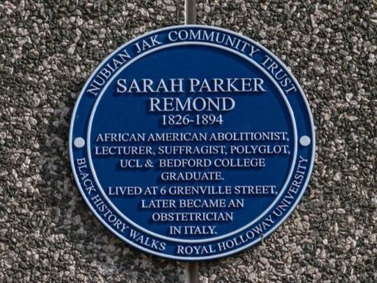 In March 2022, Sarah Parker Remond was recognized with a blue plaque, a type of marker used to denote a location’s connection to a significant person or event in the UK. The plaque is located at 6 Grenville Street in London, where she lived when she attended Bedford Ladies College, now part of University College, London. It was produced by the Nubian Jak Community Trust, sponsored by Black History Walks, and supported by UCL’s Sarah Parker Remond Centre.
